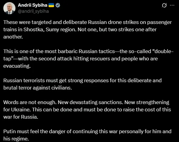 Міністр закордонних справ Андрій Сибіга відреагував на навмисні удари Росії по Шостці. Глава МЗС підкреслив, що це були прицільні та навмисні удари російських дронів по пасажирських поїздах.