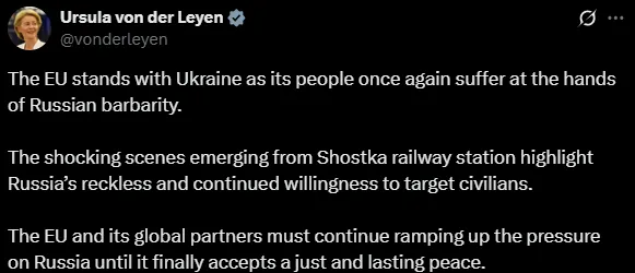 Голова Європейської комісії Урсула Урсула фон дер Ляйєн заявила в соцмережі Х, що шокуючі сцени на залізничній станції Шостка демонструють нерозсудливість та постійну готовність Росії нападати на мирних жителів.