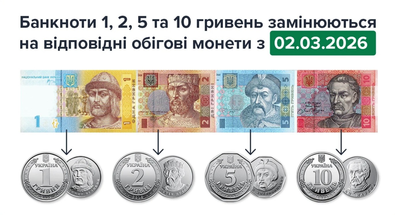 З 2 березня припиняється обіг банкнот номіналами 1, 2, 5 та 10 гривень зразків 2003-2007 років - їх повністю замінять монетами.