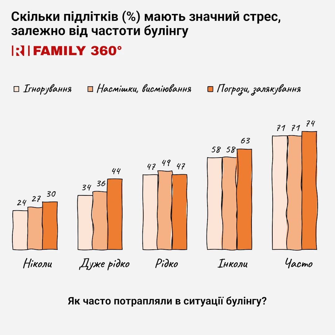 Зокрема, з ігноруванням стикалася більшість підлітків (61%) за останні пів року. Цей вид булінгу також не варто недооцінювати: систематичне ігнорування може спричинити те, що в психології називають «травмою розвитку», яка в подальшому може бути сигналом щодо деяких психічних розладів. Практично половина підлітків (49%) також відчуває на собі насмішки, знущання. Близько третини (30%) стикаються з погрозами та залякуванням. Також кожен четвертий підліток є жертвою фізичного насильства, тобто коли навмисне б’ють, штовхають, щипають, роблять боляче (28%), і знущання в інтернеті (27%), тобто кібербулінгу.