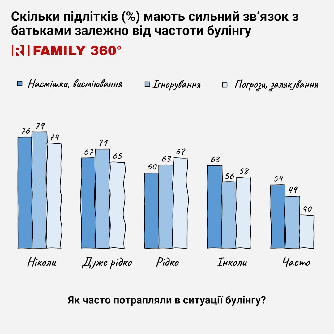 «Діти, які стикаються з булінгом, рідше говорять з батьками про свої переживання. Ми не можемо стверджувати, чи це діти закриваються від батьків, чи навпаки – батьки не готові обговорювати цю тему. Це потребує додаткових досліджень. Разом з тим, дані показали, що: 60% дітей, які не зазнавали булінгу, часто обговорюють з батьками свої почуття. А от серед тих, хто були об’єктами булінгу – таких менше половини (46%). Найчастіше замовчуються теми ігнорування, погроз і знущання в інтернеті. Діти, які стикалися з булінгом, відчувають значно слабший емоційний зв’язок з батьками. Передусім ідеться знову ж таки про ігнорування та погрози», – зауважують автори дослідження.