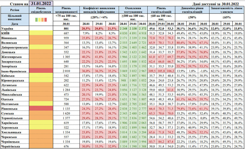 За даними за 30 січня, в Україні загалом рівень госпіталізації пацієнтів із COVID-19 становить 53,3 осіб на 100 тис. населення за норми не більше 60 осіб.на 100 тис. населення. Показник рівня госпіталізацій перевищено в десяти областях. Крім того, в семи областях перевищено показник динаміки рівня госпіталізацій.