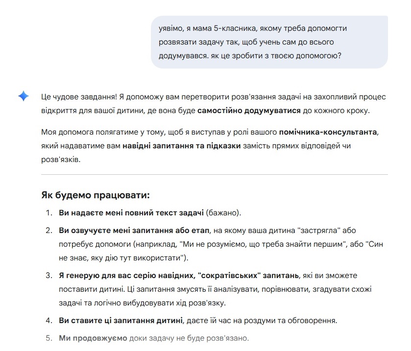 Ті, хто не користувався ШІ глибоко, можуть подумати: "Ось, зараз штучний інтелект виконає за дитину всю роботу, а як же розвиток критичного мислення? Як же розуміння матеріалу?". Насправді в користуванні Gemini в освітньому процесі мова саме про це: дитина вчиться, а не отримує готову відповідь, яку потім покаже вчителю.
