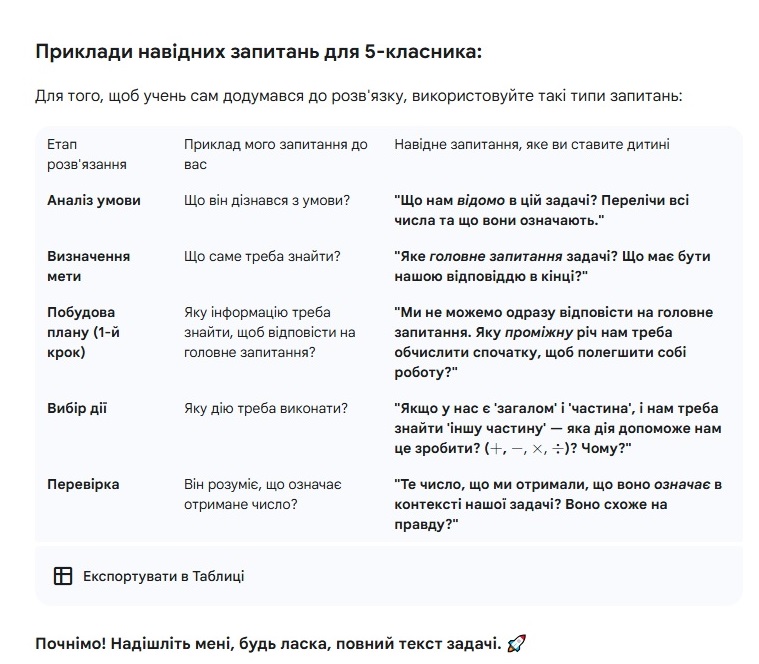 Крім того, інструмент сам може порадити, як батькам застосовувати штучний інтелект так, щоб син або донька самі приходили до правильної відповіді у задачі: