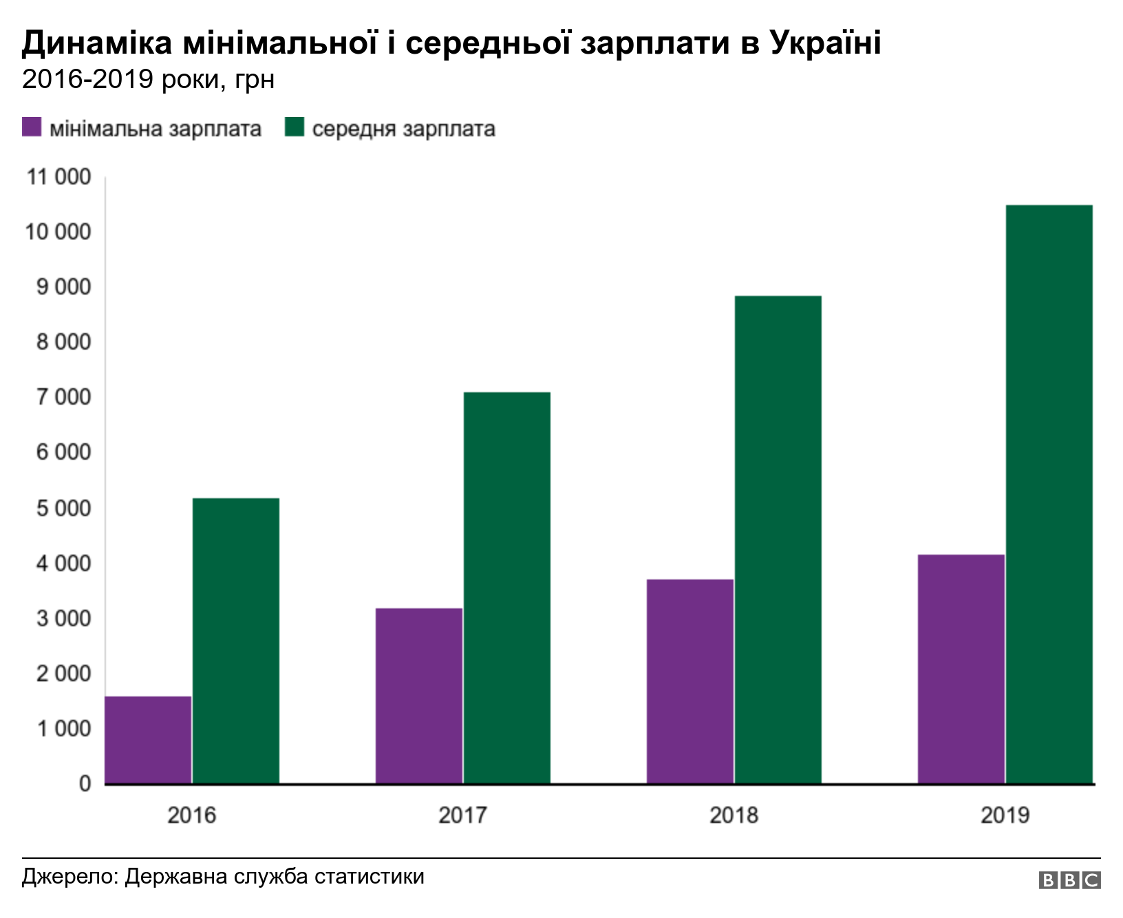 Від 2017 року, коли мінімалка зросла удвічі, середня зарплата в країні збільшувалася не так швидко. Їй знадобилося чотири роки, аби так само зрости удвічі — від 5183 грн у 2016 до 10497 у 2019.