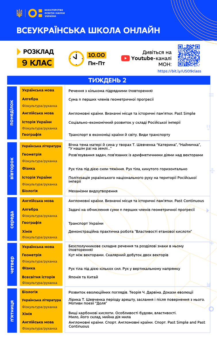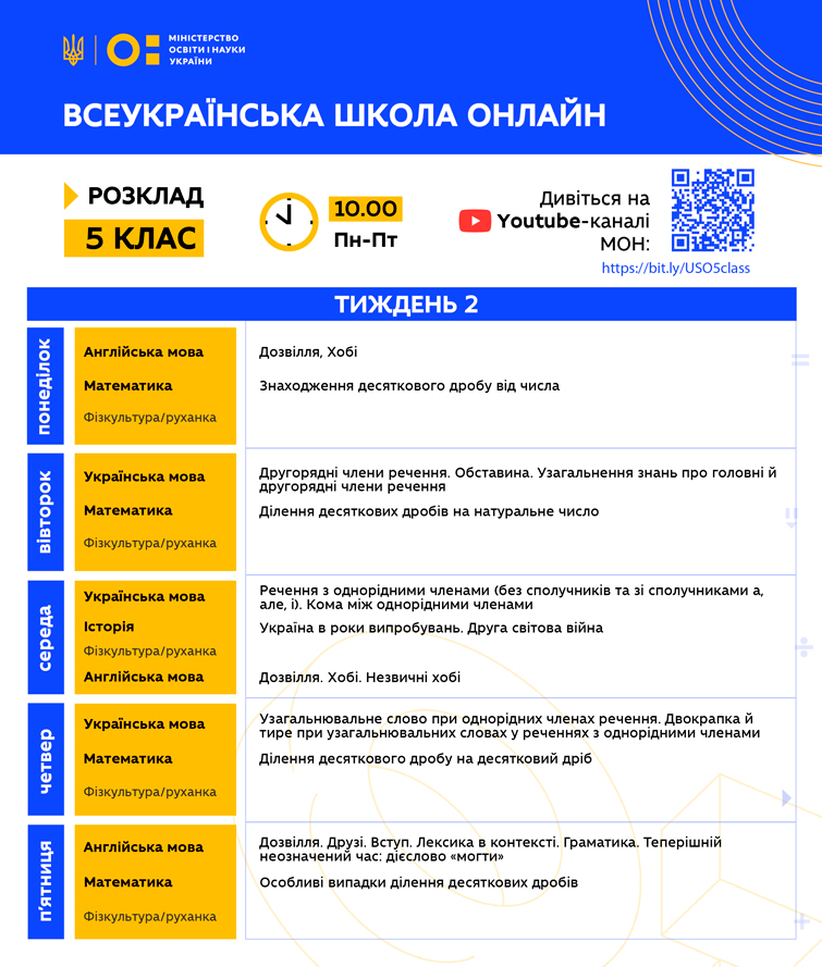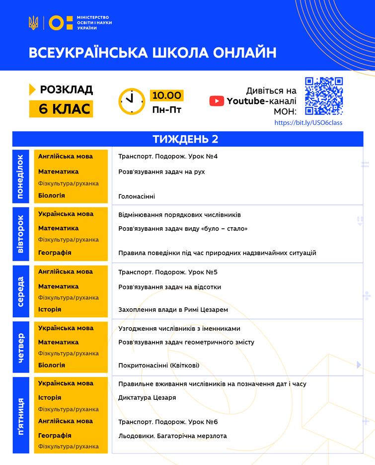 Міністерство освіти і науки опублікувало розклад уроків на YouTube-каналі МОН та теми, які висвітлюватимуться цього тижня, повідомляє life.pravda.com.ua.