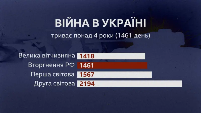 Але поки що війна для українців триває менше за Першу світову (1567 днів, від 28 липня 1914 року до 11 листопада 1918 року), і за Другу світову (2194 дні, або 6 років – від 1 вересня 1939 року до 2 вересня 1945).