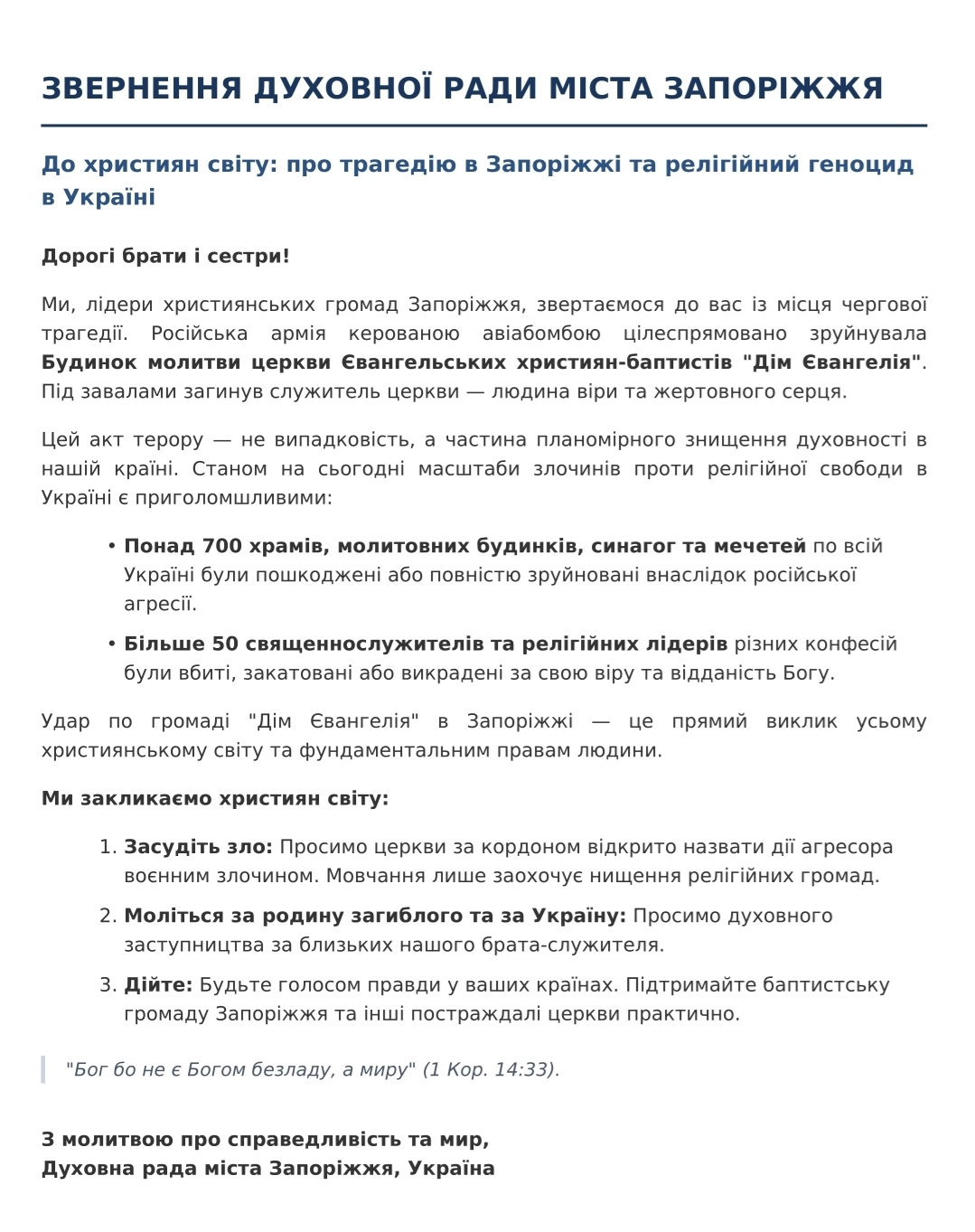 Одразу після прощання лідери християнських громад міста, стоячи на уламках «Дому Євангелія», оприлюднили Звернення Духовної ради Запоріжжя до християн світу.